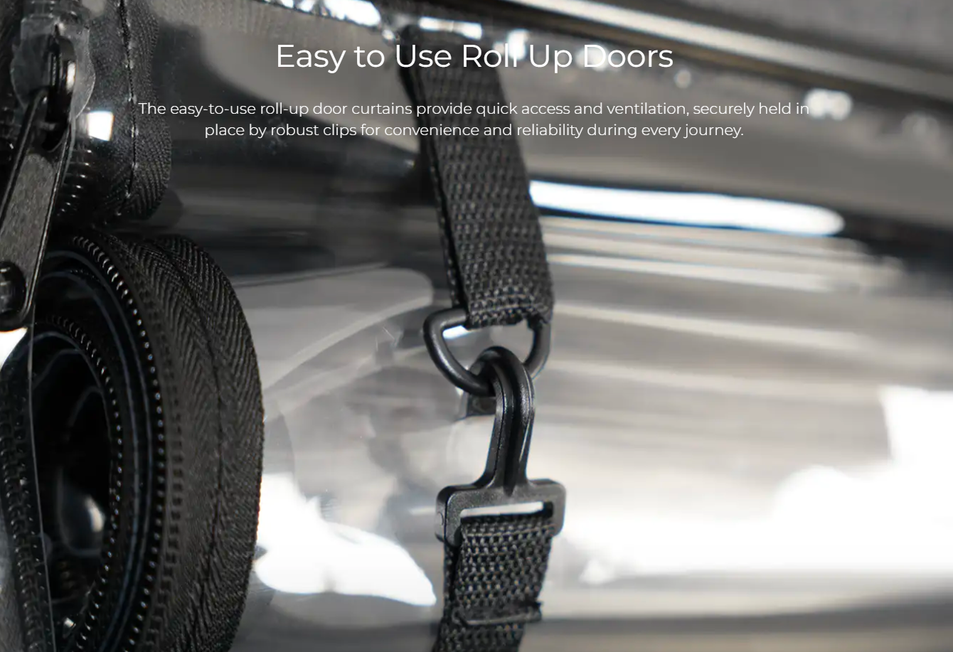 Its hard top canopy, clear windscreen, and weatherproof curtains create a warm, sheltered space in winter and a cool environment in summer, while wide pneumatic tyres provide stability across uneven ground.